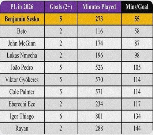 在卡里克執(zhí)教的第6場比賽中,被看好首發(fā)的謝什科仍然作為替補(bǔ)出場。其他同齡球員可能因此悶悶不樂,但這位斯洛文尼亞前鋒選擇不發(fā)表怨言,而是用表現(xiàn)來說話。7次出場打入6球,謝什科成為英超狀態(tài)最好的射手之一,2026年還沒有哪位球員在英超的非點(diǎn)球進(jìn)球數(shù)超過他的5個(gè)。